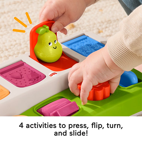 The fruit-and-vegetable pop-up playset features 4 simple yet engaging activities for babies to press, flip, turn, and slide. Each action reveals different fruits and vegetables, keeping children entertained while stimulating their curiosity. Designed for children 9 months and older, this playset is perfect for developing fine motor skills through hands-on exploration.