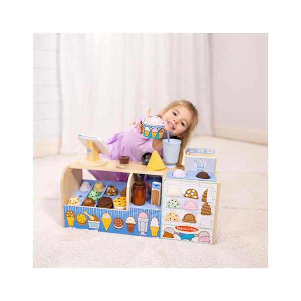 All-in-One Ice Cream Shop: This 42-piece toy food set includes wooden scoops, soft-serve swirls, cones, cups, toppings, a scooper, milkshake cup, sandwich pieces, a menu board & so much more!