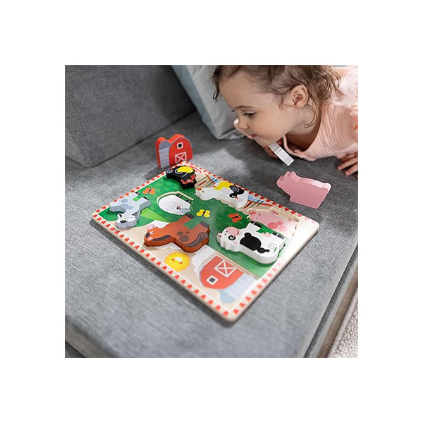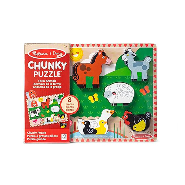 The Melissa & Doug Farm Chunky Puzzle features 8 pieces of durable and easy-to-grasp wood that display full-color pictures of farm animals. The design of the chunky wooden pieces ensures kids can easily grasp them, and they display full-color pictures beneath to offer visual clues.